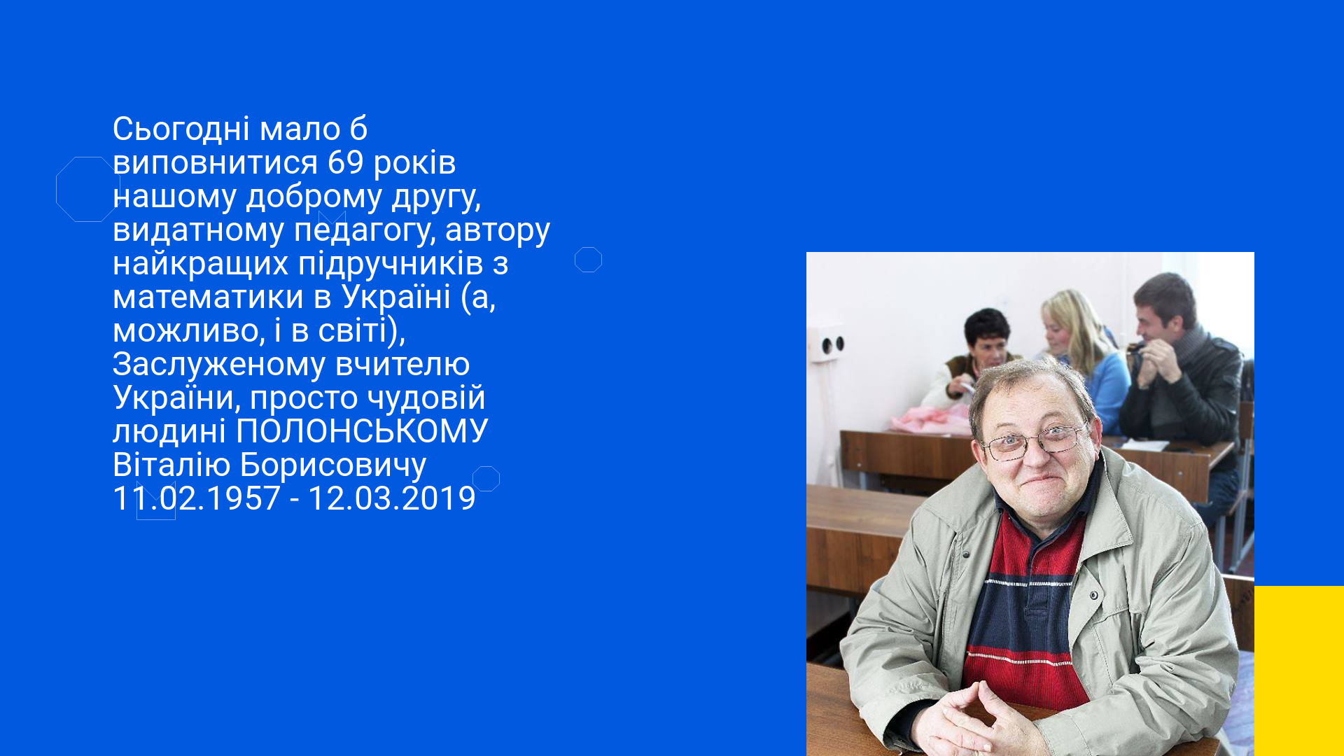 Сьогодні мало б виповнитися 69 років нашому доброму другу, видатному педагогу, автору найкращих підручників з математики в Україні (а, можливо, і в світі), Заслуженому вчителю України, просто чудовій людині ПОЛОНСЬКОМУ Віталію Борисовичу 11.02.1957 - 12.03.2019