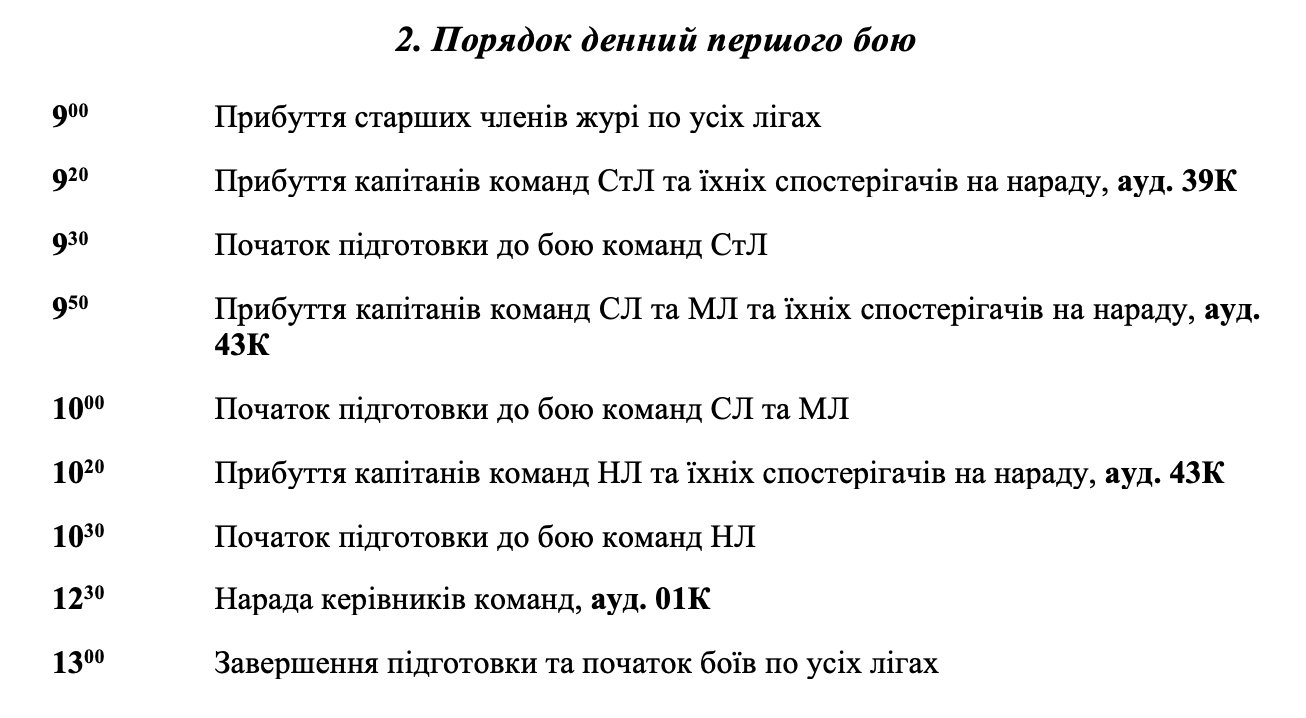 У кожній команді має бути спостерігач, який буде присутнім увесь час — від початку підготовки й до початку боїв (далі – на власний розсуд). Також у кожній команді має бути представник на нараді керівників о 12:30. З огляду на ситуацію з використанням ШІ, прошу учасників дотримуватися доброчесності, а спостерігачів — ретельно за цим стежити. У разі порушень команда буде дискваліфікована. Використання електронних пристроїв у разі нагальної потреби можливе лише в кімнаті, де сидить журі.