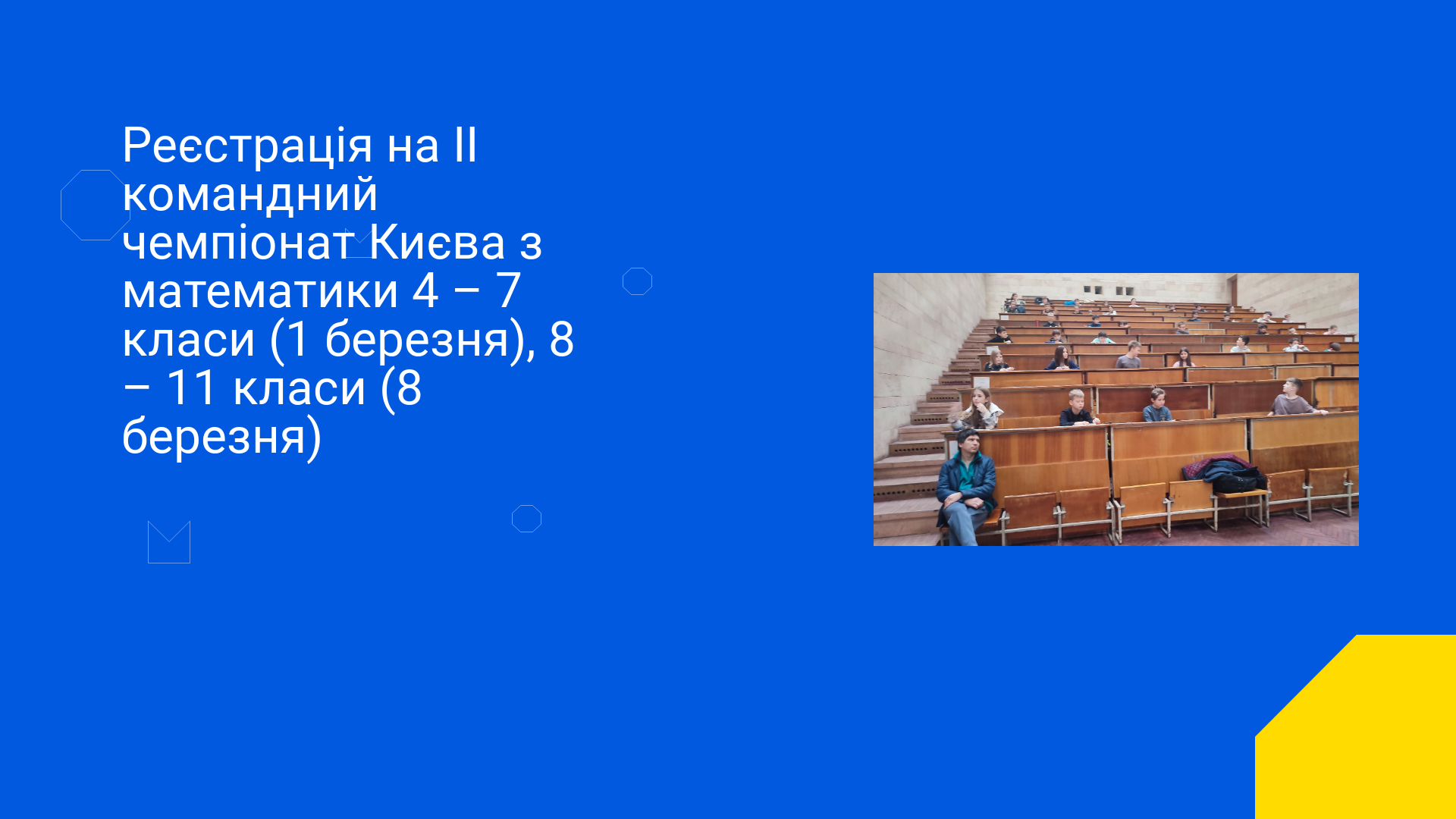 Реєстрація на ІІ командний чемпіонат Києва з математики 4 – 7 класи (1 березня), 8 – 11 класи (8 березня)