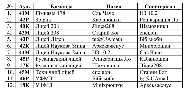 В цьому посиланні наведені аудиторії, в яких змагатимуться команди. Прошу, щоб під час змагання та по завершенні олімпіади в аудиторіях був порядок – і в сенсі чесної поведінки, і в розумінні збереження майна, прибирання сміття за собою. За коректність чесніть під час олімпіади та порядку в аудиторії несуть відповідальність спостерігачі, що присутні в цій аудиторії. Нагадую, що в разі проголошення повітряної тривоги спостерігач має вивести команду в укриття. В разі певних непорозумінь чи негараздів ми будемо звертатися до контактних осіб, що зареєстровані на сайті.