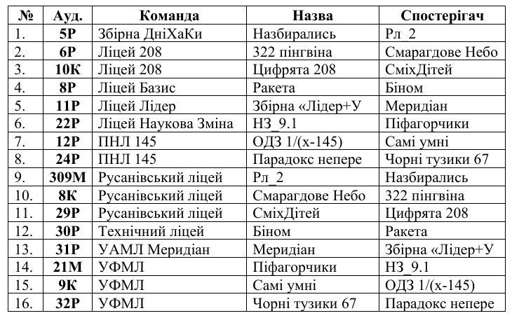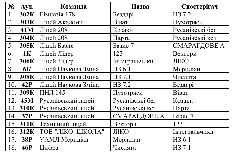 3. Розподіл аудиторій для усної командної олімпіади