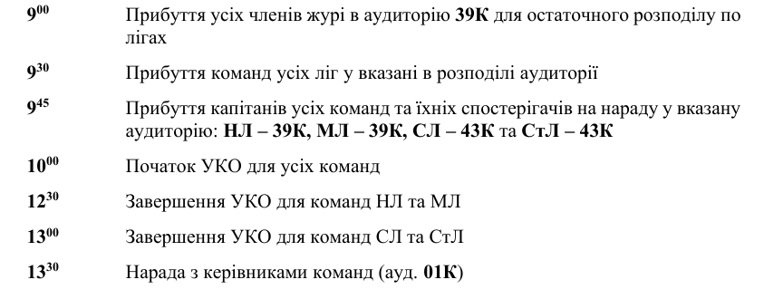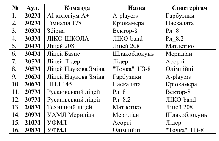 Цей раз в усіх великих лекційних аудиторіях будуть розташовані по 2 команди – одна з Наймолодшої ліги, друга з Старшої ліги. Аудиторії достатньо великі, щоб 2 команди не заважали одна одній. Прошу віднестися з розумінням до цього нюансу. В разі проблем прошу відповідальних осіб одразу звертатися до журі.