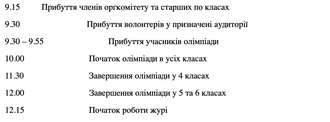 Початок олімпіади для усіх учасників учнів 10:00. Для учасників 5 та 6 класіволімпіада триватиме 2 години (120 хвилин). Для учасників 4-х класів – 1,5 години (90 хвилин).