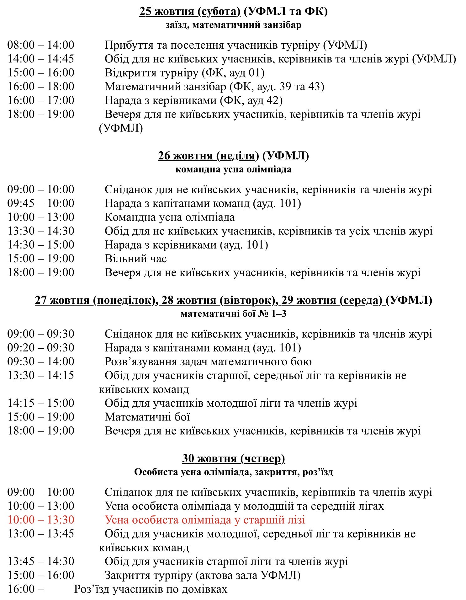 Цьогорічний XVІІI Всеукраїнський турнір математичних боїв імені академіка Ляшка буде проведений як завжди на базі Українського фізико-математичного ліцею Київського національного університету імені Тараса Шевченка з 25 по 30 жовтня 2025року. Ми будемо дуже раді гостям з усіх регіонів України, а також учням, що наразі перебувають в Києві. Будемо сподіватися, що в турнірі візьмуть участь принаймні по 4 команди у кожній з трьох ліг, але ми готові прийняти і більшу кількість. Нагадаю, що на разі УФМЛ – місце проведення турніру, проживання та харчування учасників та журі – працює в звичному режимі. В укриття спокійно вміщуються усі учні та працівники школи, тому підготовка до боїв та самі бої триватимуть і в разі повітряної тривоги. Нижче написаний порядок денний нашого турніру. Зазначу, що в останній день турніру (30 жовтня) відбудеться Усна особиста олімпіада, присвячена пам’яті видатних вчителів УФМЛ – Леоніду Савченку та Віктору Вишенському. У цій олімпіаді запрошуються до участі не лише учасники XVІІІ Всеукраїнського турніруматематичних боїв, а й інші бажаючі. За будь-яких умов усі такі додаткові учасники також мають своєчасно зареєструватися.